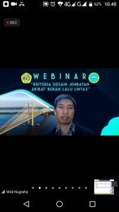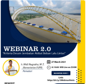 Sabtu , 27 Maret 2021, Hima Teknik Sipil mengadakan webinar dengan tema “Kriteria Desain Jembatan Akibat Beban Lalulintas” dengan pembicara Ir. Widi Nugraha, MT (Kementerian PUPR)